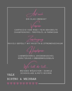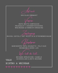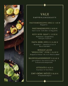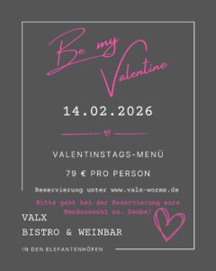 Das „VALX“ ist übrigens nicht nur ein Bistro bzw. eine Weinbar, sondern auch eine Eventlocation. Ob für private Feiern oder geschäftliche Veranstaltungen, ihr könnt das „VALX“ ganz oder teilweise mieten und eure eigenen besonderen Momente schaffen. Lasst euch von uns bei der Planung eurer besonderen Veranstaltung unterstützen und erlebt unvergessliche Momente im historischen Ambiente des ehemaligen Weinguts Valckenberg.